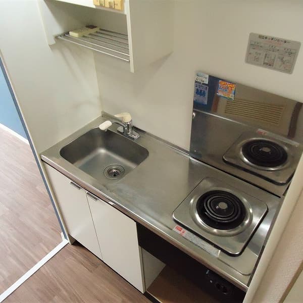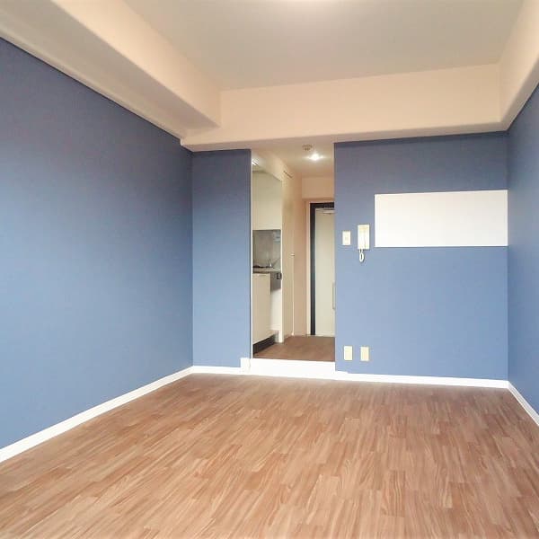 室内はブルーの壁とホワイトの天井が鮮やかな印象的な1R。